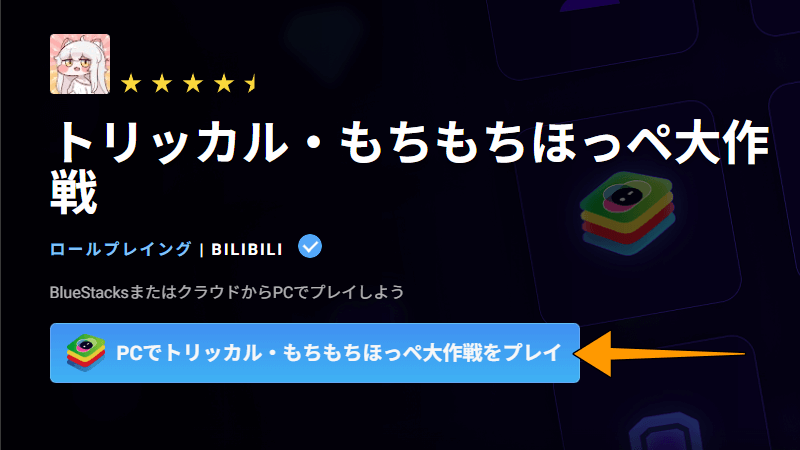 Bluestacksの公式サイトに入り、「PCでトリッカル・もちもちほっペ大作戦をプレイ」をクリックします。