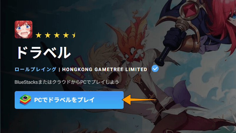 Bluestacksの公式サイトに入り、「PCでドラベルをプレイ」をクリックします。