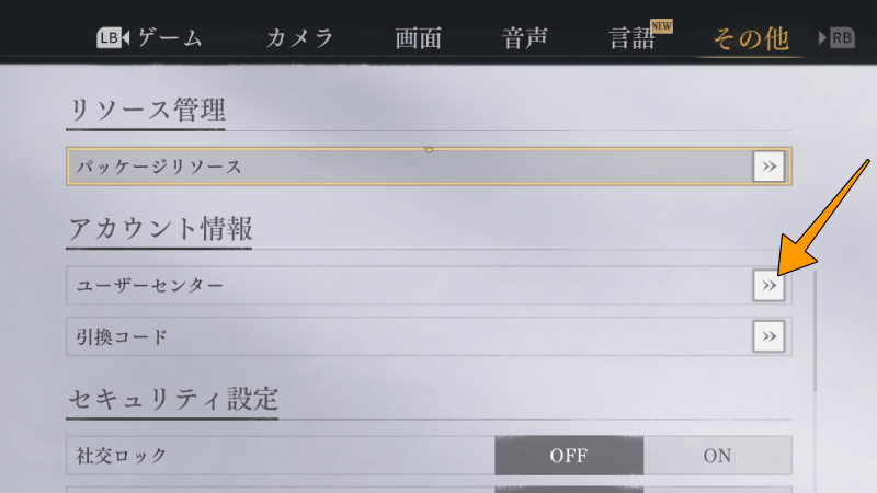 - 設定画面の「RB」をクリックして、上部右側に隠れている「その他」、「ユーザーセンターの>>」をクリックします。