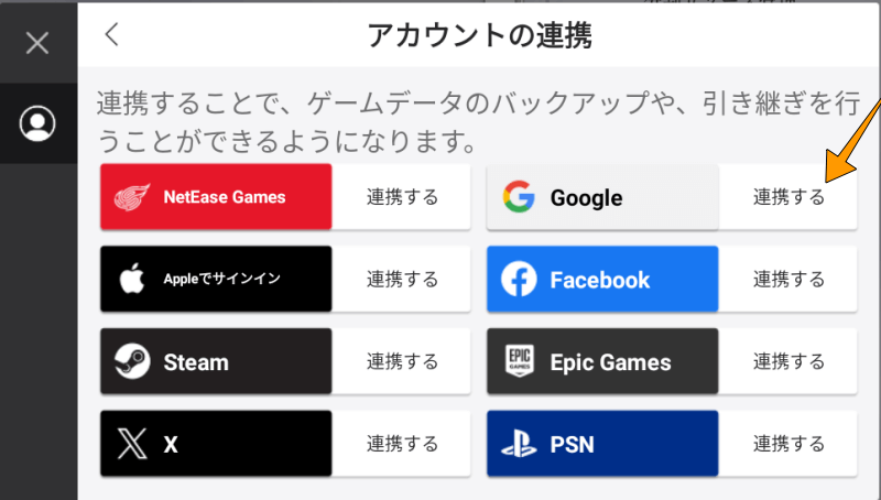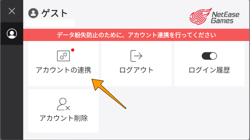 まずは、現在プレイしている端末(スマホ・BlueStacksなど)でアカウント連携します。