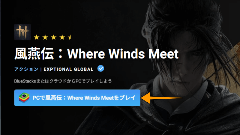 Bluestacksの公式サイトに入り、「PCで風燕伝:Where Winds Meetをプレイ」をクリックします。
